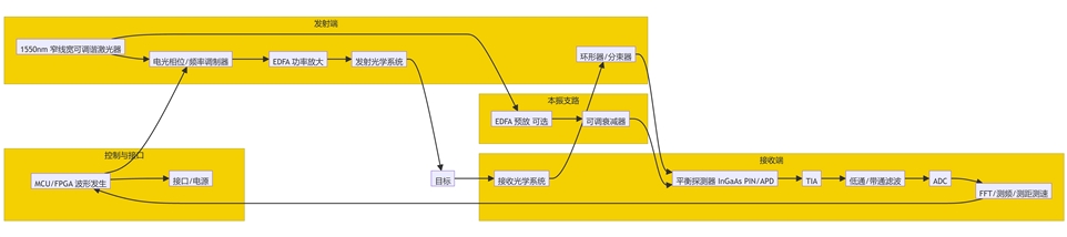 l 光源:窄线宽可调谐半导体激光器(或 DFB + 外调制),产生线性调频连续波。