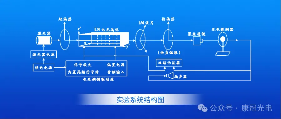 在内调制的基础上,开展了如图18所示的电光调制实验。激光器发出的光经起偏器,激光变成线 偏振光,光垂直入射到施加了外加电场的 LN 电光 晶体上,折射率以及光波的偏振态发生改变,以椭圆 偏振光输出,通过调制器驱动源产生的直流偏置或 出射光经过1/4波片,均能使电光调制器工作在线 性区域。椭圆偏振光经检偏器,又以线偏振光输出,光强被调制,最后光电探测器接收调制后的光信号, 经光/电转换后由示波器观察。