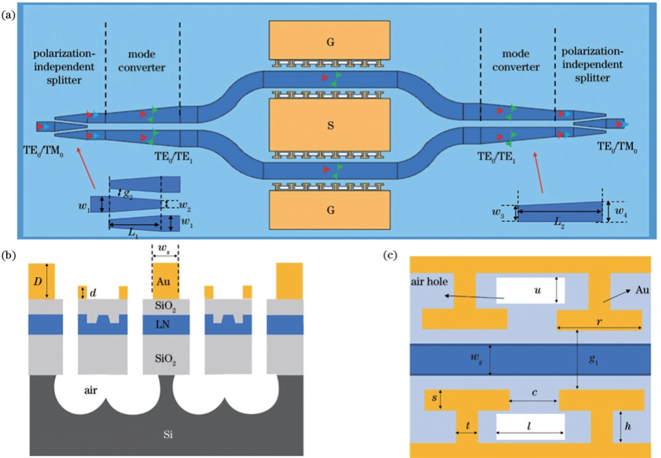所提基于TFLN的偏振无关电光调制器如图1(a)所示。整体结构基于1个对称的MZI,包括2个偏振无关光分束器、4个模式转换器和1个电光相位调制器。偏振无关光分束器将TM0和TE0模式均匀地分成两束光,而后通过模式转换器将TM0转换为TE1模式,同时保持TE0模式不变。在调制区域,TE0和TE1这两种模式同时由相同的电场通过周期性电容加载的行波电极结构进行调制。图1(b)为调制器的截面结构,硅衬底上方是3µm厚的二氧化硅,X切铌酸锂膜层的总厚度为400nm,半刻蚀的方式使得铌酸锂脊波导的高度为200nm,在铌酸锂上方生长300nm的二氧化硅以降低金属吸收损耗,波导宽度wg为2.84µm。调制器采用周期性电容加载的行波电极结构,由金属主电极和周期性微结构电极组成,微结构电极阻止电流在靠近两个主电极之间的区域流动,保证电流在较为宽的主电极结构中分布更均匀。因此,在不扩大电极间隙的情况下,增加了导体有效尺寸,在减小微波传输损耗的同时,提高调制效率,突破带宽-半波电压的制衡关系。但这种电极结构会导致传输线的每单位长度的电容增加,相对于传统的行波电极结构来说其微波群速度将会显著降低,造成严重的速度失配,可对硅衬底进行去除以降低微波的群折射率,实现光波和微波的速度匹配。为了保证器件的机械强度,在S电极下方保留了一部分硅衬底以进行支撑。行波电极的结构参数包括D、d、ws、r、c、s、t、h、u、g1、l,值分别为1.1、0.2、78、47、3、2、5、15、9、4.6、39μm,微结构电极细节如图1(c)所示。