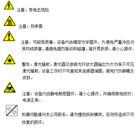 1.激光器及光源输出为不可见激光辐射,设备工作时不可直视其连接器端面,避免灼伤眼睛及皮肤。