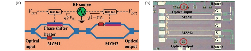 图16 硅基双串联 MZM 的示意图和显微图[34]。(a)示意图;(b)显微图