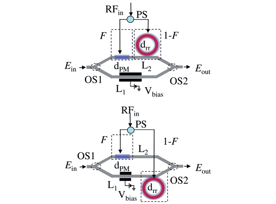 为 了 进 一 步 提 高 RAMZM 的 线 性 化 效 果,Dingel等[37]提出了一种具 有 相 位 调 制 和 腔 调 制 组 件的线性调制器(IMPACC)。该调制器将 MZM 调 制器中的射频驱动相位调制器(PM)和微环谐振器 (RR)组合,如图20 所示,组合方式有两种,一种是 PM 与 RR 集中在 MZI的一个调制臂上,另一种是 PM 与 RR 分别放置在 MZI的两个调制臂上。该调 制器的特点是 PM 和 RR 由频率相同但功率不同的 射频信号驱动,射频功率由可变射频功率分配器控 制。输出光的基频与三阶失真项均是与射频功率比 有关的函数,通过调制射频功率比和微环透射系数,可以将IMPACC 模型简化为 RAMZI和标准 MZI 调制 器,所 以 IMPACC 可 以 看 作 是 RAMZM 与 MZM 的统一化模型。IMPACC 的独特优势在于其 有内部微环透射系数与外部射频功分比两个参数相