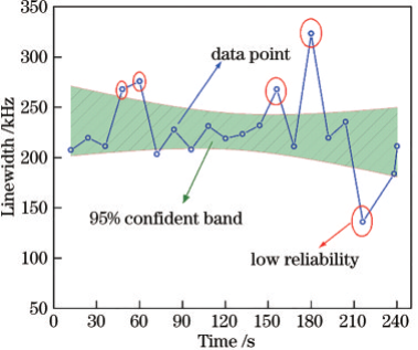 线宽的动态特性是线宽真实值随时间变化的特性。理论上,本征线宽反映的是从激光腔发射出来的光学频率的最小扩散,不考虑光频随时间的漂移。但实际上,激光器线宽的测量是在一定时间范围内完成的,只能采用极小时间内的测量结果表征本征线宽。而激光器在时域上除了受自发辐射产生的相位噪声影响外,还会受到外部技术噪声的影响(如机械振动导致的噪声),因此激光器输出的光学频率在时域上是不稳定的,总会存在一定的频率抖动,且时间窗口越长,频率抖动越多,动态线宽的测量结果如图 5 所示。可以发现,随着时间的增加,激光的频率抖动会逐渐增多, 因此 150s 以后线宽的测量误差较大,不可当作线宽的本征值。动态线宽的波动范围在 200~260kHz内,置信区间为图 5 中的阴影部分,圆圈表示测量结果中置信概率小于 95% 的数据点。在激光器应用中,线宽越小,意味着光谱的纯净度越高,激光的单色性越好,对应的相干性也就越强。