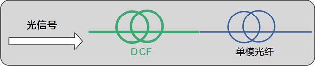 实际应用中,传输线路采用DCF和单模光纤串联的方式,补偿单模光纤在1550nm光波长的正色散,达到延长中继距离,减少损耗的目的,从而实现高速度、大容量、长距离的通信。如下图所示: